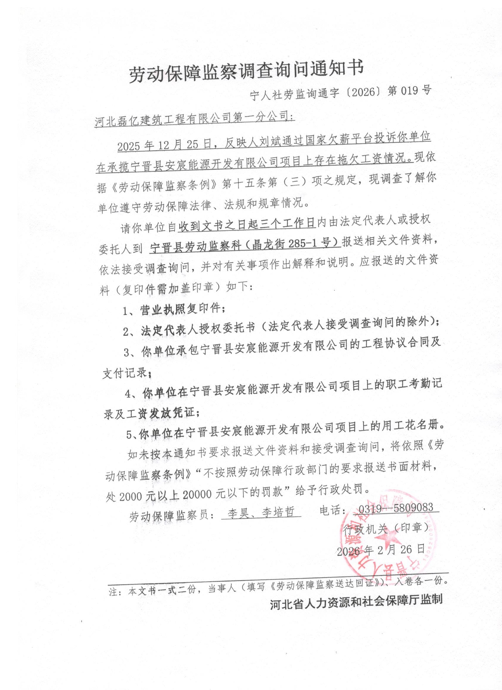 本机关受理刘斌反映你单位在承包安辰能源项目上存在拖欠工资一案时,因通过直接、邮寄等送达方式均无法向你单位送达,根据《中华人民共和国民事诉讼法》第九十五条等有关规定,向你单位公告送达《劳动保障监察调查询问通知书》(宁人社劳监询通字〔2026〕第019号)。